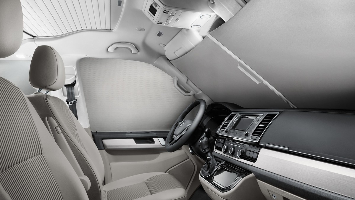Mais le van aménagé 4 couchages California Coast automatique est aussi – évidemment – un van aménagé tourné vers l’extérieur. Un auvent situé au-dessus de la porte latérale coulissante vient agrandir l’espace de vie, pour abriter par exemple la table amovible et les chaises et tabourets pliants (astucieusement intégrés à l’habillage de la porte coulissante et du hayon arrière).