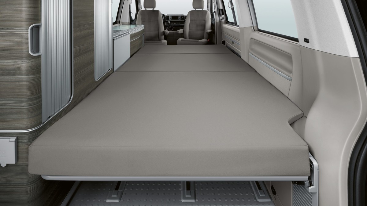 À la nuit tombée, le coin couchage du van aménagé 4 places California Coast T6 automatique Volkswagen se dévoile grâce à 2 lits double convertibles. Le premier - de 114x200 cm - est situé « en bas », dans l’espace séjour. Composé de la banquette arrière convertible couplée à une rallonge de lit intégrée, il se déplie très facilement en 2 mouvements. Il ne vous reste alors plus qu’à tirer le surmatelas fourni pour vous coucher dans un environnement aussi confortable que chez vous. A la différence que « chez vous » n’est pas forcément au pied d’un lac ou au cœur d’une forêt ! Le second lit double – 120x200 cm – est « à l’étage », et se révèle en levant le toit escamotable. Il bénéficie d’un sommier et d’un matelas de qualité, sur lequel vous pourrez vous tenir en position assise. Une manière comme une autre de contempler, par les « fenêtres » à moustiquaires intégrées, l’aube se lever sur le « nightspot » de rêve que vous n’aurez manqué de dénicher la veille ! Tous les couchages possèdent des veilleuses dédiées et des prises 12V à proximité, et l’occultation de l’habitacle peut être totale grâce aux stores intégrés.